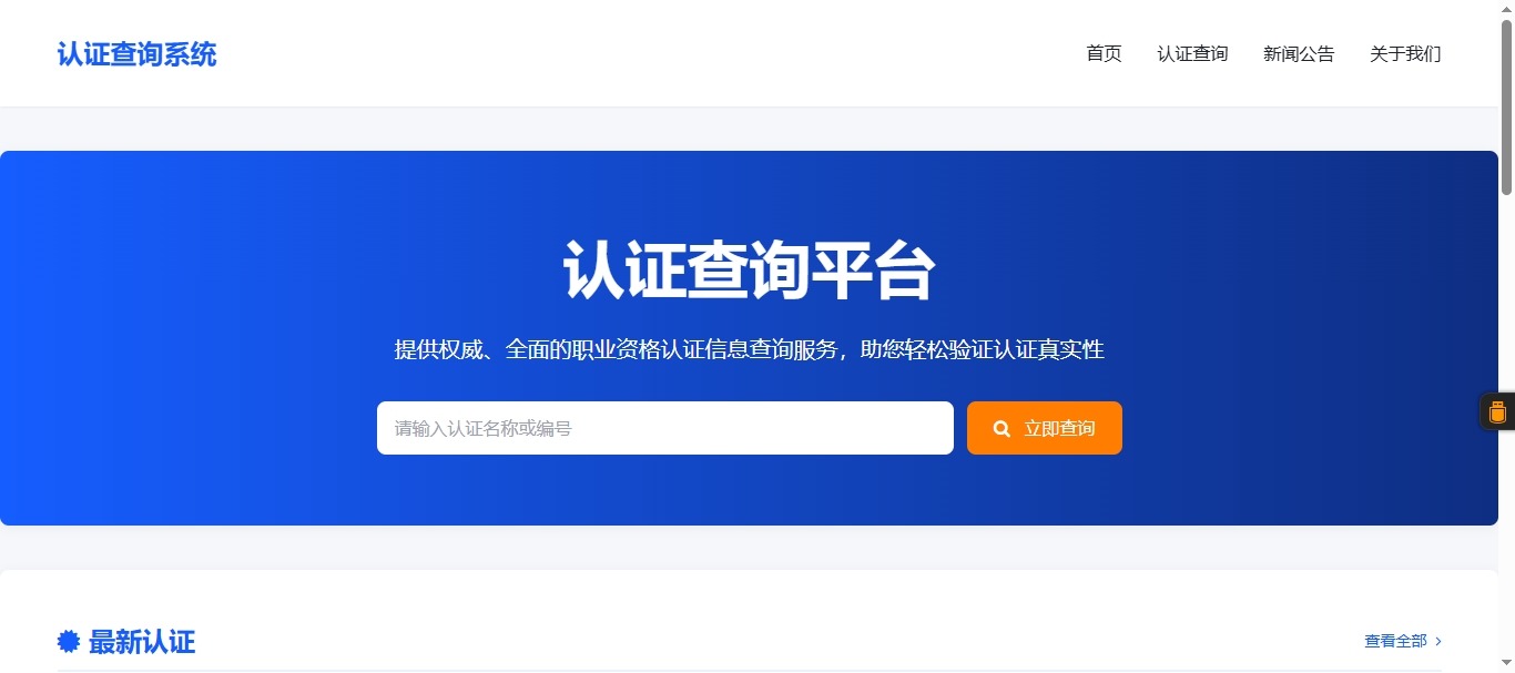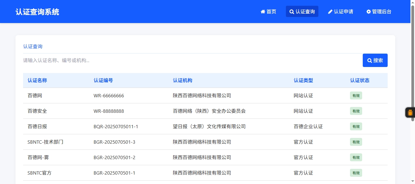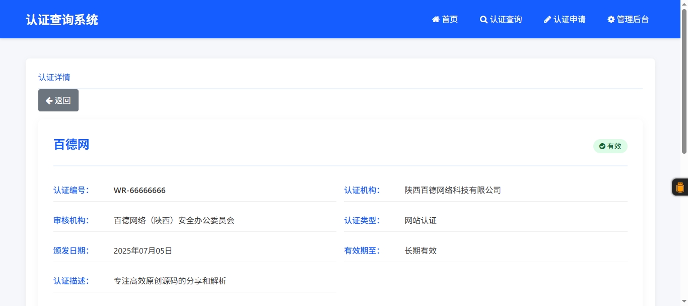 源码截图 在线体验地址:https://blog.xbaide.com/auth 环境要求 本系统全套简洁无后门,对服务器无任何要求 PHP>=5.6 MySQL>=5.6 安装教程 1、将db.sql导入到数据库即可 2、访问http://你的域名/admin即可 3、后台默认账号密码:admin 视频教程